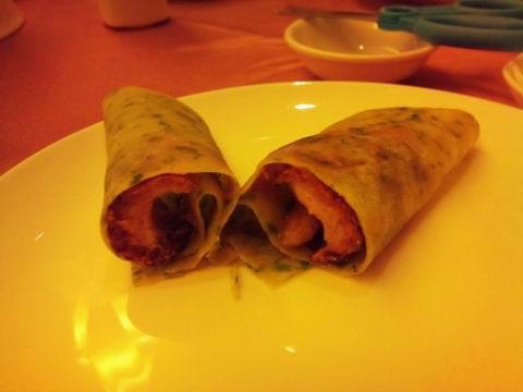 這是配料左下炸過的蔥+右下的辣味增,和烤鴨一起捲在三星蔥的餅皮裡.