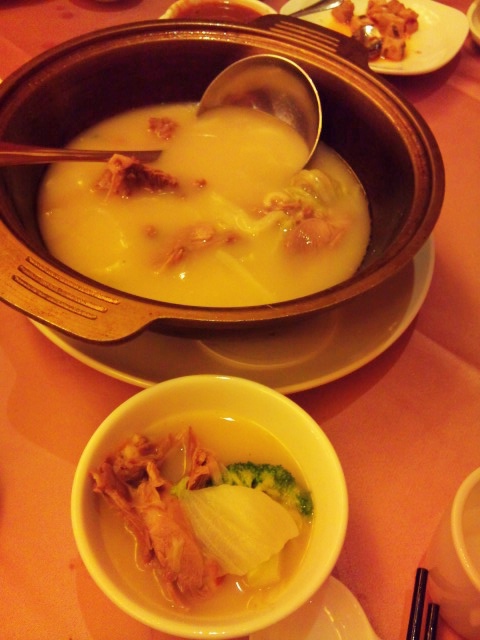 用老母雞熬的湯,裡面還有白菜和綠椰菜,和鴨肉.