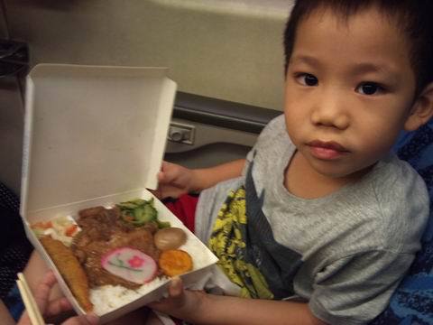火車開始行駛,兩個導遊底迪就開始發今日晚餐,熱騰騰的火車便當一人一個。