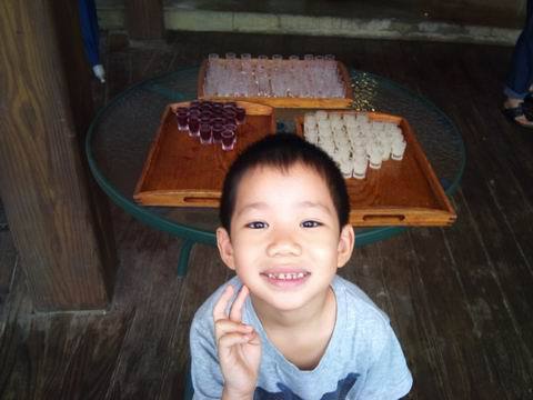 大人 則是要先喝右邊白色的"原住民養樂多"(小米酒),在喝紅色的果汁。